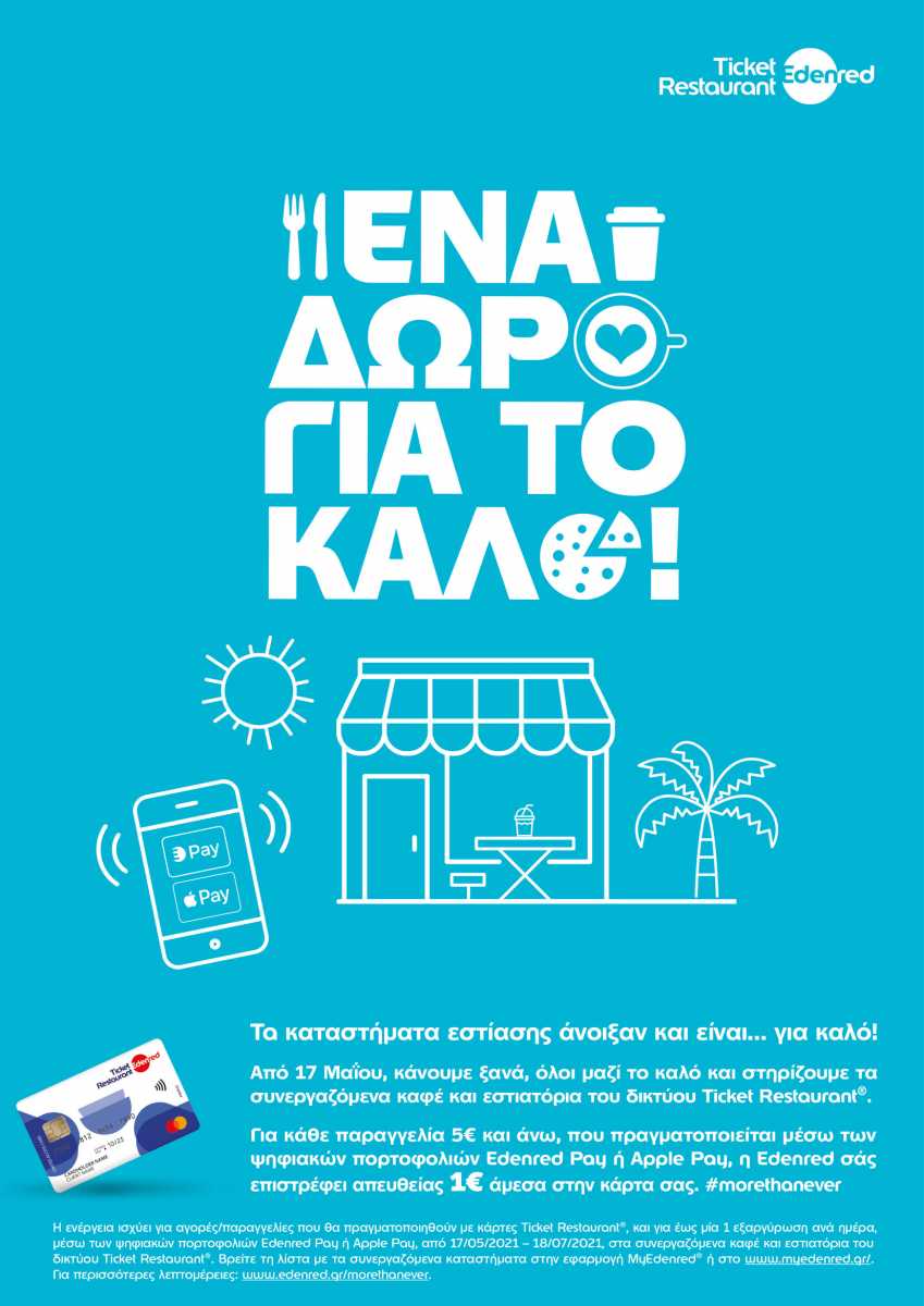 Μέχρι τις και 18 Ιουλίου, η Edenred καλεί τους κατόχους Ticket Restaurant®, να κάνουν «ένα δώρο για το καλό» επιλέγοντας να απολαύσουν, μέσω της κάρτας Ticket Restaurant®, αγαπημένες γεύσεις, από αγαπημένα καφέ και εστιατόρια του συνεργαζόμενου δικτύου. Με στόχο να ευχαριστήσει και να επιβραβεύσει τους καταναλωτές για τη συμμετοχή τους, για κάθε συναλλαγή από €5 και άνω, η Edenred επιστρέφει €1 στον χρήστη, σαν ένα ελάχιστο ευχαριστώ. Η επιστροφή του ποσού πραγματοποιείται απευθείας στην κάρτα και κατόπιν εκκαθάρισης της συναλλαγής.