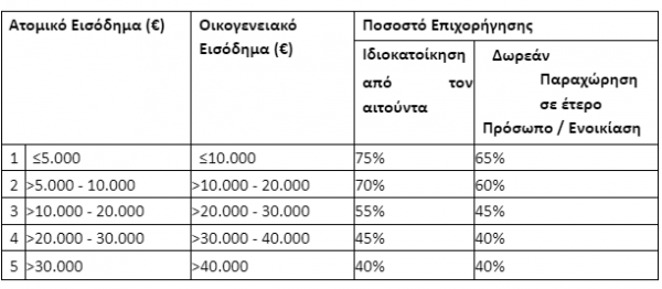 Το ποσοστό της επιδότησης είναι κλιμακωτό, ανάλογα με την εισοδηματική κατηγορία στην οποία θα ενταχθεί ο αιτών και ορίζεται ως εξής: