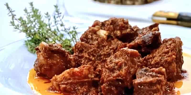 Αίγα (κατσίκα) κοκκινιστή με χοντροκομμένες πατάτες τηγανητές