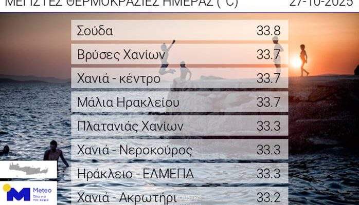 Άγγιξε τους 34 βαθμούς η μέγιστη θερμοκρασία στη βόρεια Κρήτη