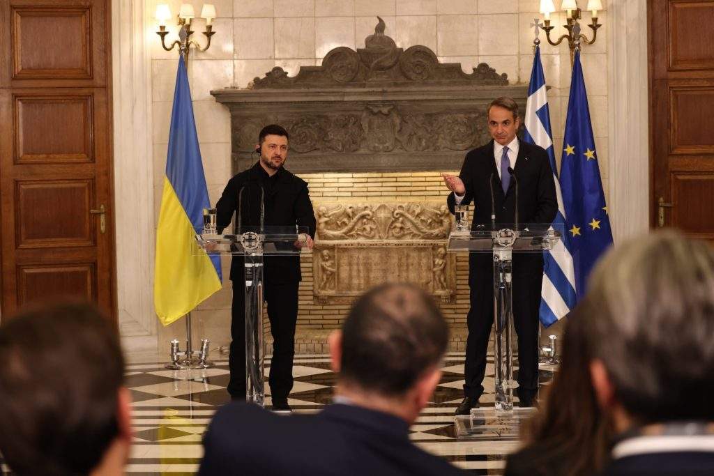 Ο πρωθυπουργός Κυριάκος Μητσοτάκης και ο πρόεδρος της Ουκρανίας Βολοντίμιρ Ζελένσκι παραθέτουν κοινές δηλώσεις στους εκπροσώπους του Τύπου μετά την συνάντησή τους στο Μέγαρο Μαξίμου και την υπογραφή της ενεργειακής συμφωνίας