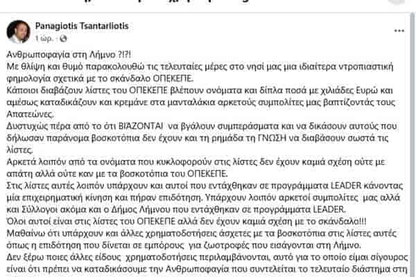 Ανθρωποφαγία στη Λήμνο; Ξέσπασμα Τσανταρλιώτη για τη διαπόμπευση αθώων για το σκάνδαλο του ΟΠΕΚΕΠΕ!