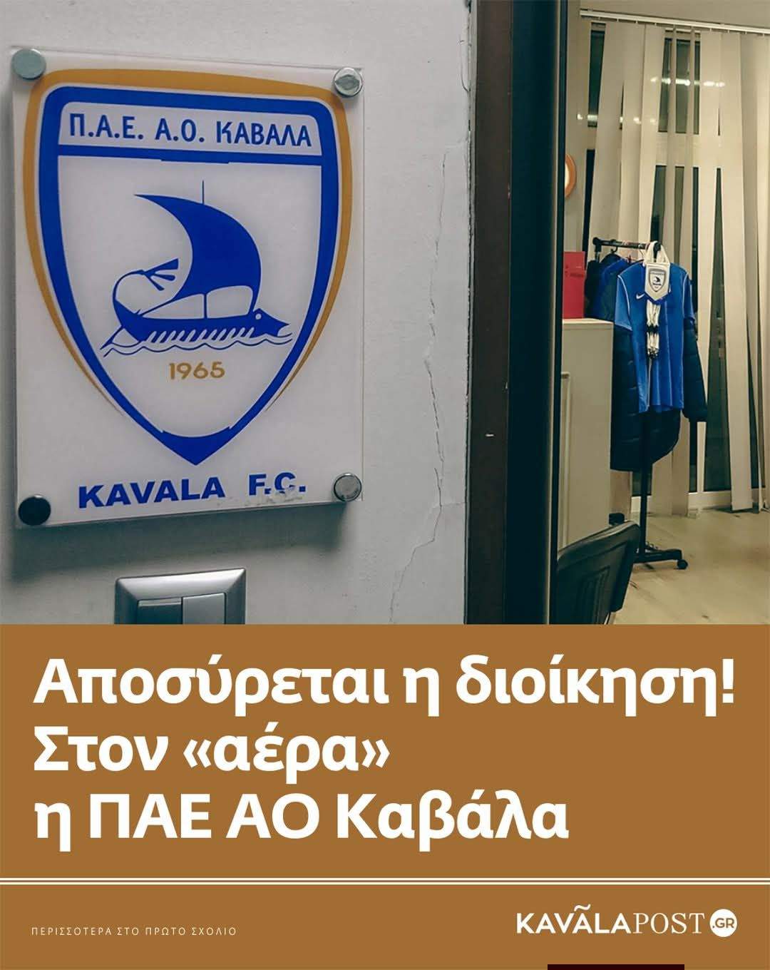 Η Διοίκηση της ΠΑΕ ΑΟ ΚΑΒΑΛΑ θα ήθελε να ενημερώσει τους φιλάθλους, τους ποδοσφαιριστές, το τεχνικό επιτελείο και όλους όσοι στάθηκαν στο πλευρό της ομάδας, ότι μετά τα τελευταία γεγονότα και τις εξελίξεις που έχουν έρθει στην επικαιρότητα, αποφασίστηκε η απόσυρση της παρούσας διοίκησης από τη διοίκηση του συλλόγου.