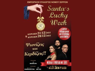ΣΕΡΡΕΣSanta’s Lucky Week από τον Εμπορικό Σύλλογο Ν. ΣερρώνSanta’s Lucky Week από τον Εμπορικό Σύλλογο Ν. Σερρών Μετάβαση στην Πηγή SERRES POST Author: ...By ΕΙΔΗΣΕΙΣ 24722 Δεκεμβρίου, 2025