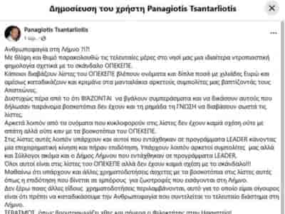 LIMNOSΑνθρωποφαγία στη Λήμνο; Ξέσπασμα Τσανταρλιώτη για τη διαπόμπευση αθώων για το σκάνδαλο του ΟΠΕΚΕΠΕ!Ανθρωποφαγία στη Λήμνο; Ξέσπασμα Τσανταρλιώτη για τη διαπόμπευση αθώων για το σκάνδαλο του ΟΠΕΚΕΠΕ! Μετάβαση ...By ΕΙΔΗΣΕΙΣ 2473 Αυγούστου, 2025