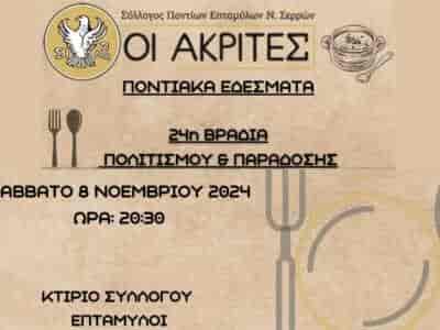 ΣΕΡΡΕΣΣύλλογος Ποντίων Επταμύλων Ν.Σερρών «ΟΙ ΑΚΡΙΤΕΣ» – Βραδιά Ποντιακών ΕδεσμάτωνΣύλλογος Ποντίων Επταμύλων Ν.Σερρών «ΟΙ ΑΚΡΙΤΕΣ» – Βραδιά Ποντιακών Εδεσμάτων Μετάβαση στην Πηγή SERRES POST ...By ΕΙΔΗΣΕΙΣ 24725 Οκτωβρίου, 2025