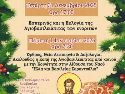 LIMNOSΛήμνος: Πρωτοχρονιά στο Πλατύ, ώρες και ακολουθίες στον Ιερό Ναό Αγίου ΓεωργίουΛήμνος: Πρωτοχρονιά στο Πλατύ, ώρες και ακολουθίες στον Ιερό Ναό Αγίου Γεωργίου Μετάβαση στην Πηγή ...By ΕΙΔΗΣΕΙΣ 24730 Δεκεμβρίου, 2025
