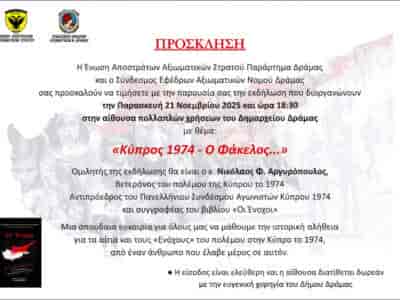 ΔΡΑΜΑΔράμα: Εκδήλωση για την Τουρκική εισβολή στην Κύπρο το 1974Δράμα: Εκδήλωση για την Τουρκική εισβολή στην Κύπρο το 1974 Μετάβαση στην Πηγή ΕΡΓΑΣΙΑ ΣΥΝ ...By ΕΙΔΗΣΕΙΣ 24714 Νοεμβρίου, 2025