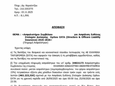 ΚΟΙΝΩΝΙΑΕΛΤΑ / Μια μέρα πριν παραιτηθεί από τα ΕΛΤΑ ο Σκλήκας ασφαλίστηκε για 461.000 ευρώ (Δείτε το έγγραφο)ΕΛΤΑ / Μια μέρα πριν παραιτηθεί από τα ΕΛΤΑ ο Σκλήκας ασφαλίστηκε για 461.000 ευρώ ...By ΕΙΔΗΣΕΙΣ 24714 Νοεμβρίου, 2025