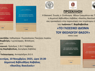 ΡΟΗ ΕΙΔΗΣΕΩΝΚαβάλα | Παρουσίαση του έργου «Το γλωσσικό ιδίωμα του Θεολόγου Θάσου»Μια ξεχωριστή εκδήλωση αφιερωμένη στη γλωσσική και πολιτιστική κληρονομιά της Θάσου θα πραγματοποιηθεί τη Δευτέρα ...By ΕΙΔΗΣΕΙΣ 2476 Νοεμβρίου, 2025