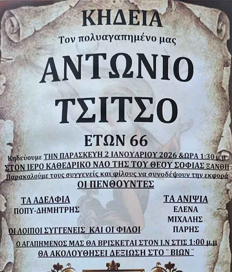 (video) – Το xanthipost.gr σας εύχεται μια χρονιά γεμάτη υγεία, αισιοδοξία και καλά νέα! ΕΙΔΗΣΕΙΣ 24731 Δεκεμβρίου, 2025 ΞΑΝΘΗ