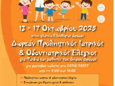 ΔΡΑΜΑΔωρεάν Προληπτικοί Ιατρικοί και Οδοντιατρικοί έλεγχοι στον Δήμο Δράμας από τον Οργανισμό «Το Χαμόγελο του Παιδιού»Δωρεάν Προληπτικοί Ιατρικοί και Οδοντιατρικοί έλεγχοι στον Δήμο Δράμας από τον Οργανισμό «Το Χαμόγελο του ...By ΕΙΔΗΣΕΙΣ 2477 Οκτωβρίου, 2025