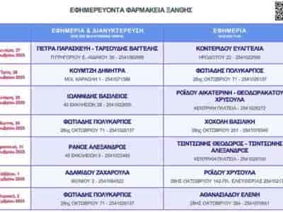 ΞΑΝΘΗΕφημερεύοντα Φαρμακεία της Ξάνθης από 27 Οκτωβρίου έως 2 Νοεμβρίου 2025Εφημερεύοντα Φαρμακεία της Ξάνθης από 27 Οκτωβρίου έως 2 Νοεμβρίου 2025 Μετάβαση στην Πηγή ΞΑΝΘΗ ...By ΕΙΔΗΣΕΙΣ 24727 Οκτωβρίου, 2025