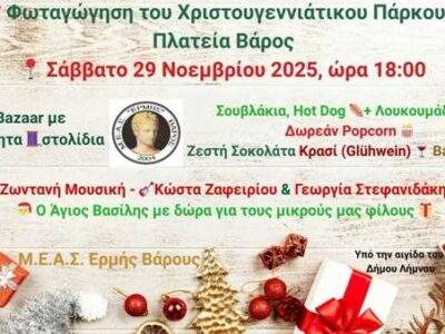 LIMNOSΞεκινά το Χριστουγεννιάτικο θαύμα, Φωταγώγηση του Πάρκου στην Πλατεία του Βάρους!Ξεκινά το Χριστουγεννιάτικο θαύμα, Φωταγώγηση του Πάρκου στην Πλατεία του Βάρους! Μετάβαση στην Πηγή LIMNOS ...By ΕΙΔΗΣΕΙΣ 24713 Νοεμβρίου, 2025