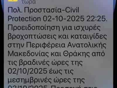 ΞΑΝΘΗΜήνυμα 112 στην Ξάνθη για ακραία καιρικά φαινόμενα – Προειδοποίηση για ισχυρές καταιγίδες και βροχοπτώσειςΜήνυμα 112 στην Ξάνθη για ακραία καιρικά φαινόμενα – Προειδοποίηση για ισχυρές καταιγίδες και βροχοπτώσεις ...By ΕΙΔΗΣΕΙΣ 2473 Οκτωβρίου, 2025