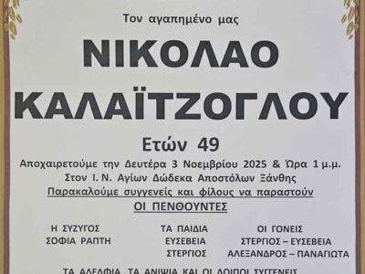 ΞΑΝΘΗΘλίψη στην Ξάνθη: Έφυγε από τη ζωή ο Νικόλαος Καλαϊτζόγλου στα 49 του χρόνιαΘλίψη στην Ξάνθη: Έφυγε από τη ζωή ο Νικόλαος Καλαϊτζόγλου στα 49 του χρόνια Μετάβαση ...By ΕΙΔΗΣΕΙΣ 2472 Νοεμβρίου, 2025