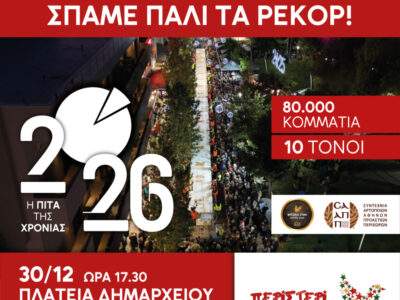 ΡΟΗ ΕΙΔΗΣΕΩΝΠεριστέρι: Η Βασιλόπιτα ρεκόρ που θα σπάσει όλα τα κοντέρ – 10 τόνοι και πάνω από 100 μέτρα μήκοςΠεριστέρι: Η Βασιλόπιτα ρεκόρ που θα σπάσει όλα τα κοντέρ – 10 τόνοι και πάνω ...By ΕΙΔΗΣΕΙΣ 24730 Δεκεμβρίου, 2025
