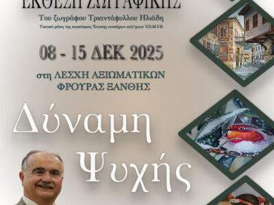 ΡΟΗ ΕΙΔΗΣΕΩΝΞάνθη: Έκθεση ζωγραφικής «Δύναμη Ψυχής» στη Λέσχη ΑξιωματικώνΗ Ανώτατη Στρατιωτική Διοίκηση Θράκης διοργανώνει έκθεση ζωγραφικής με τίτλο «Δύναμη Ψυχής» του ζωγράφου Τριαντάφυλλου ...By ΕΙΔΗΣΕΙΣ 2474 Δεκεμβρίου, 2025