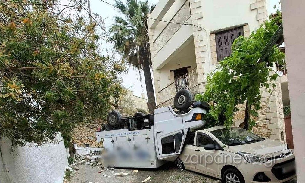 Χανιά: Φορτηγό ανετράπη και έπεσε πάνω σε σταθμευμένο όχημα – Εικόνες