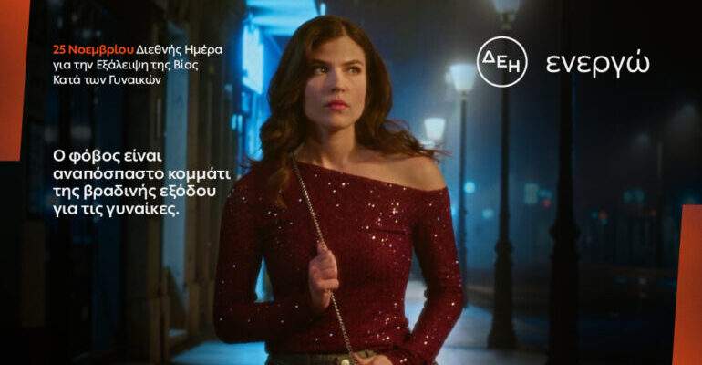 Για πέμπτη συνεχή χρονιά η ΔΕΗ συμμετέχει ενεργά στη Διεθνή Ημέρα για την Εξάλειψη της Έμφυλης Βίας, φωτίζοντας μια καθημερινή και βαθιά ριζωμένη εμπειρία ανασφάλειας, τον φόβο που βιώνουν γυναίκες όλων των ηλικιών κατά τη βραδινή τους έξοδο.
