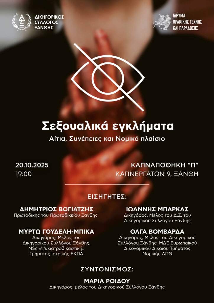 Το ‘Ίδρυμα Θρακικής Τέχνης και Παράδοση και ο Δικηγορικός Σύλλογος Ξάνθης, διοργανώνουν, την Δευτέρα 20 Οκτωβρίου 2025, στις 19:00, στην Καπναποθήκη ΄΄Π΄΄, διάλεξη με θέμα: «Σεξουαλικά εγκλήματα: Αίτια, Συνέπειες και Νομικό πλαίσιο»