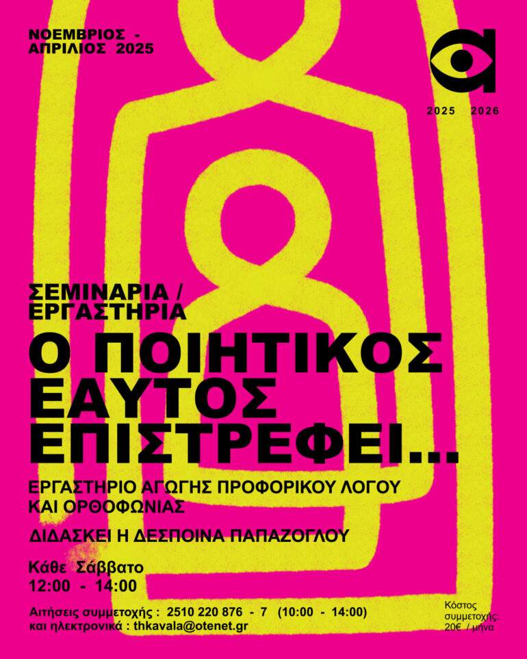 Το ΔΗ.ΠΕ.ΘΕ. Καβάλας ανακοινώνει την έναρξη του βιωματικού εργαστηρίου αγωγής προφορικού λόγου και ορθοφωνίας «Ο Ποιητικός Εαυτός Επιστρέφει…», με εισηγήτρια τη Δέσποινα Παπάζογλου.
