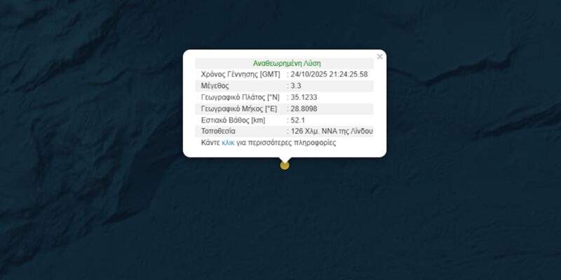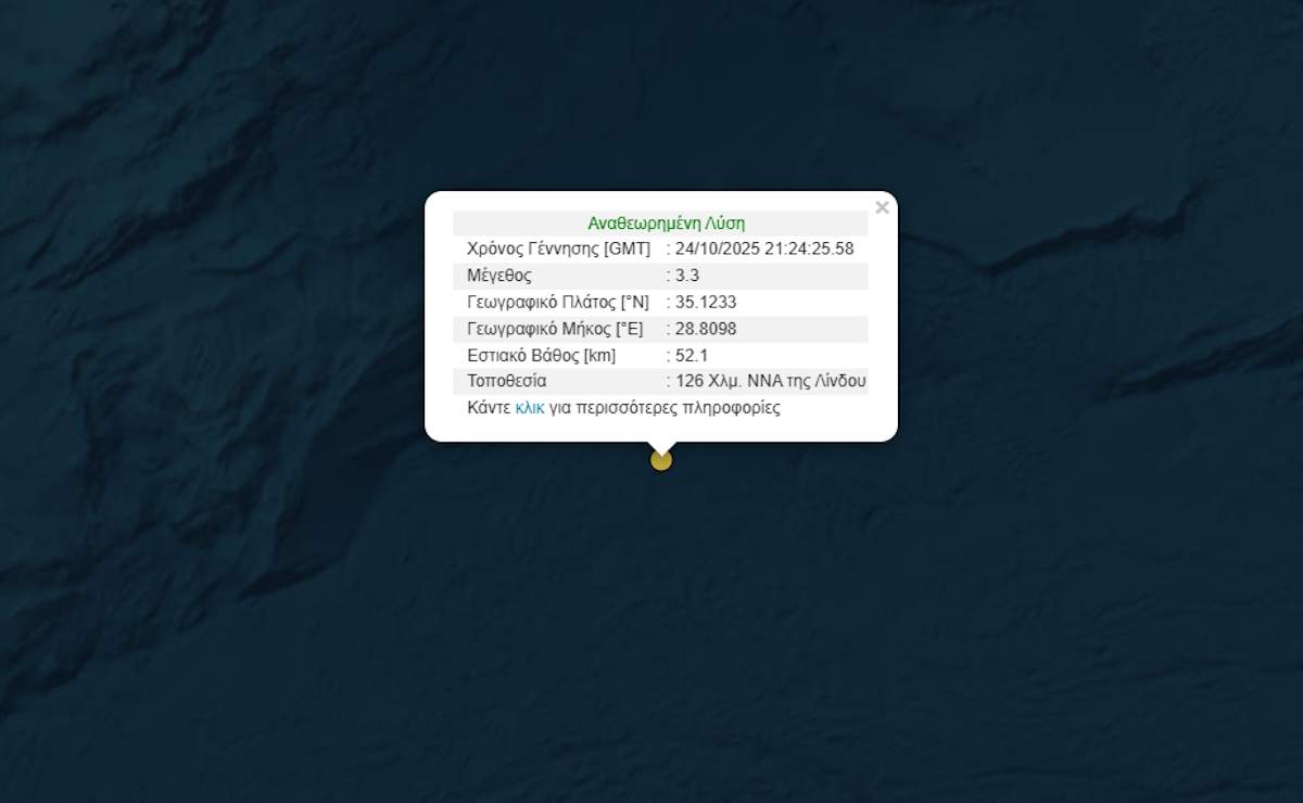 Δόνηση 3,3 Ρίχτερ κοντά στη Ρόδο – Εστιακό βάθος 52,1 χιλιόμετρα