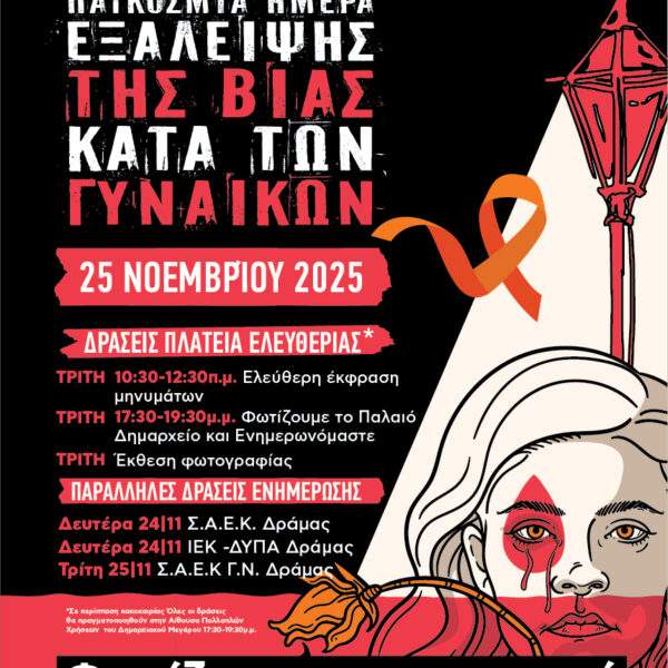 ΔΡΑΜΑΕκδηλώσεις στη Δράμα για την Παγκόσμια Ημέρα Εξάλειψης της Βίας κατά των ΓυναικώνBy ΕΙΔΗΣΕΙΣ 24719 Νοεμβρίου, 2025