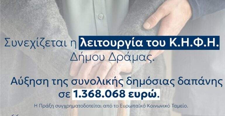 Τη συνέχιση της λειτουργίας του Κέντρου Ημερήσιας Φροντίδας Ηλικιωμένων (Κ.Η.Φ.Η.) του Δήμου Δράμας, με αυξημένη χρηματοδότηση, διασφαλίζει η Περιφέρεια Ανατολικής Μακεδονίας και Θράκης, μέσω του Προγράμματος «Ανατολική Μακεδονία, Θράκη 2021-2027».
