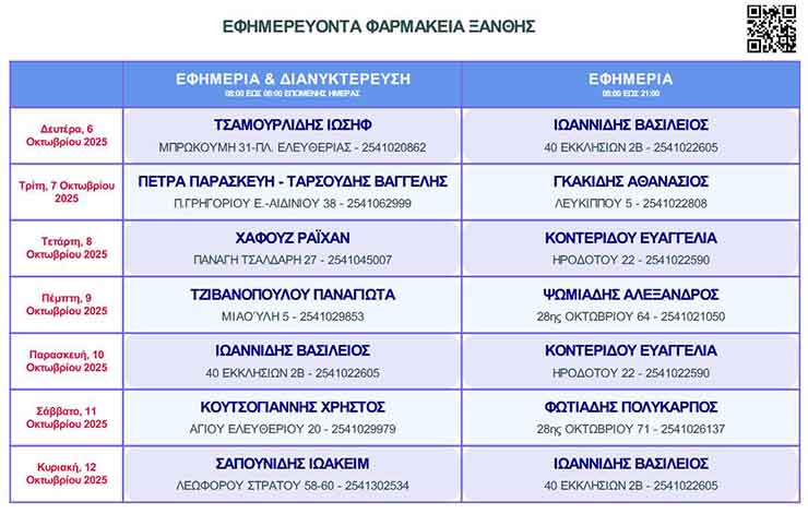 Εφημερεύοντα Φαρμακεία της Ξάνθης από 6 έως 12 Οκτωβρίου 2025