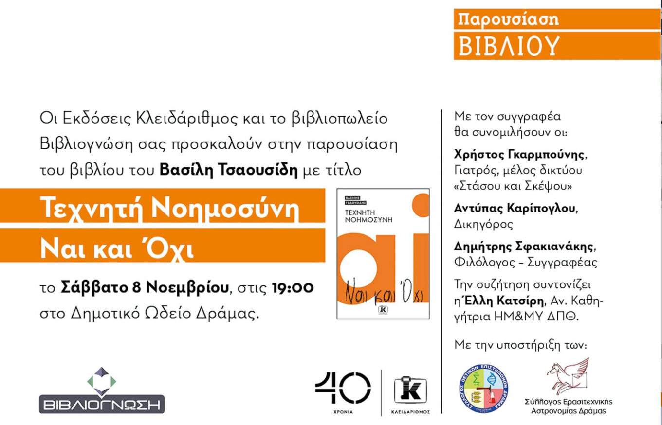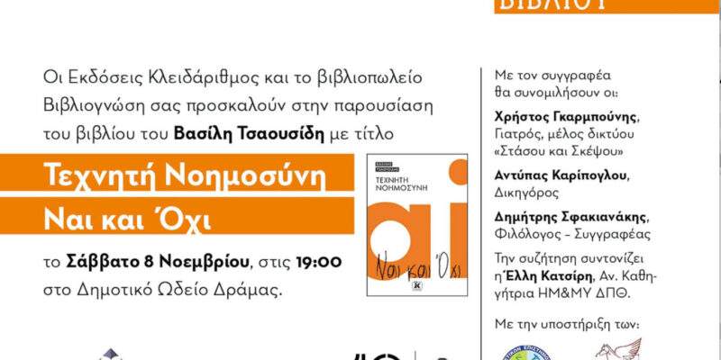Εκδήλωση παρουσίασης του βιβλίου «Τεχνητή Νοημοσύνη Ναι και Όχι» του Βασίλη Τσαουσίδη