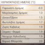 Στη βόρεια Ελλάδα κυρίως από το βράδυ της Κυριακής και τη Δευτέρα θα χιονίσει και σε περιοχές με χαμηλότερο υψόμετρο. (πολύ προσοχή σε Δυτική Μακεδονία) . Η θερμοκρασία το διήμερο θα πέσει συνολικά κατά 8 με 10 βαθμούς στα κεντρικά και βόρεια και στα υπόλοιπα κατά 3 με 5 βαθμούς Κελσίου, επανερχόμενη εκεί σε κανονικά επίπεδα για την εποχή. Οι βορειοανατολικοί άνεμοι στο Κεντρικό και το Βόρειο Αιγαίο θα φτάσουν τα 7 με 8 μποφόρ.