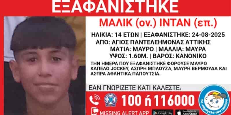 Εξαφάνιση 14χρονου στην περιοχή του Αγίου Παντελεήμονα – Τι αναφέρει το «Χαμόγελο του Παιδιού»