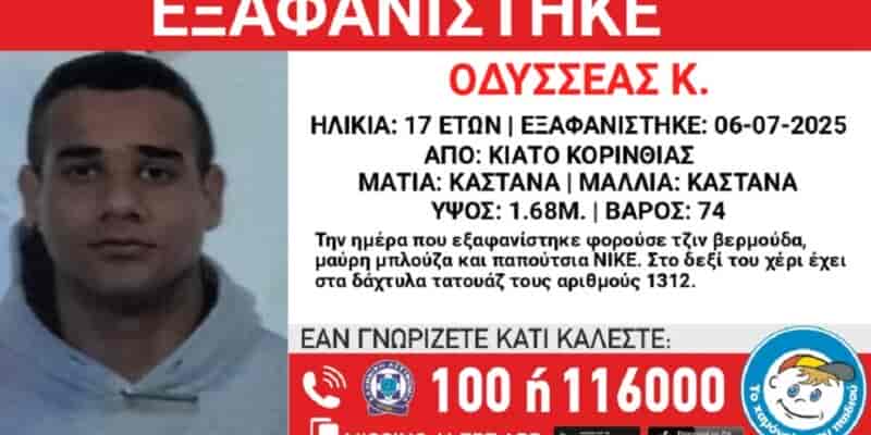 Εξαφανίστηκε ο 17χρονος Οδυσσέας από το Κιάτο – Η ανακοίνωση από το «Χαμόγελο του Παιδιού»