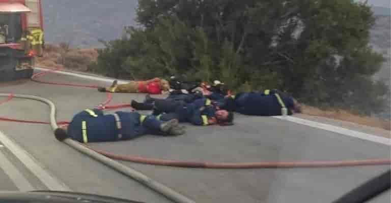 Φωτιά στη Χίο: Εξαντλημένοι πυροσβέστες κοιμούνται στην άκρη του δρόμου – Συγκλονιστική εικόνα