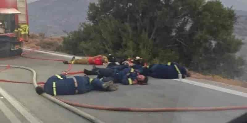 Φωτιά στη Χίο: Συγκλονιστική φωτογραφία από το μέτωπο – Εξαντλημένοι πυροσβέστες κοιμούνται στη μέση του δρόμου