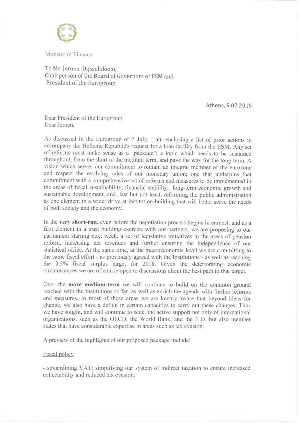 Η αποκάλυψη της επιστολής Τσακαλώτου προς Ντάισεμπλουμ τον Ιούλιο του 2015 και η αντίδραση του πρώην υπουργού Οικονομικών