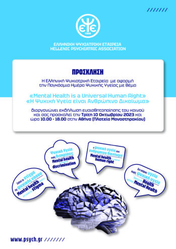Όπως κάθε χρόνο, έτσι και φέτος, με αφορμή την Παγκόσμια Ημέρα Ψυχικής Υγείας, που τιμάται κάθε χρόνο στις 10 Οκτωβρίου, η Ελληνική Ψυχιατρική Εταιρεία προχωρά σε μια δράση ενημέρωσης και ευαισθητοποίησης του κοινού για την ψυχική υγεία.