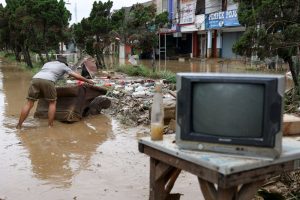 Κάτοικος προσπαθεί να σώσει τα προσωπικά του αντικείμενα μετά την πλημμύρα. REUTERS/Ajeng Dinar Ulfiana