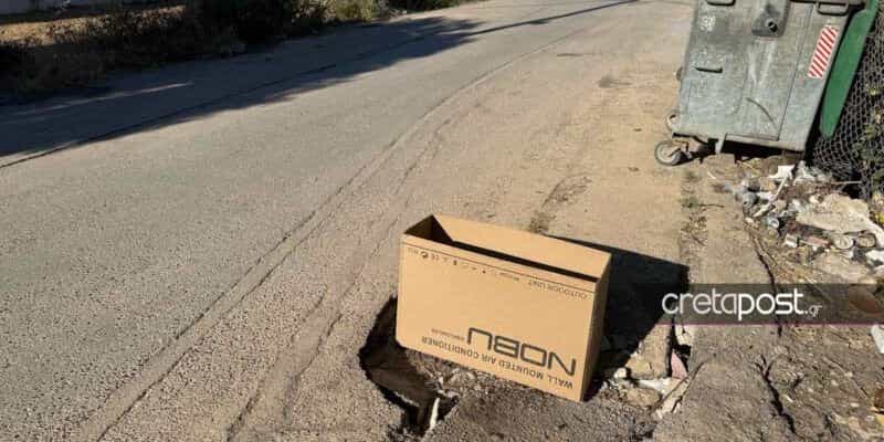Ηράκλειο: «Μπάλωσαν» μεγάλη λακκούβα στο δρόμο με χαρτόκουτο