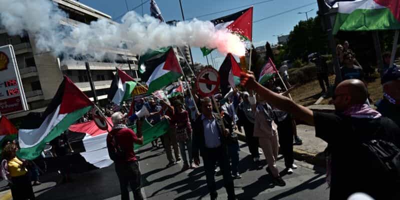 Καπνογόνα έξω από την πρεσβεία του Ισραήλ σε πορεία υπέρ της Παλαιστίνης: «Να σταματήσει τώρα η γενοκτονία στη Γάζα»