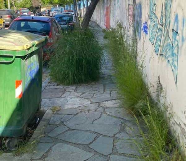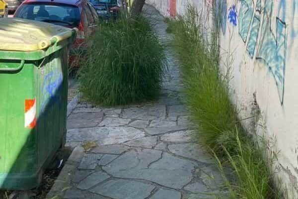Σε απελπιστική κατάσταση βρίσκεται το πεζοδρόμιο της οδού Αρκαδίου στον Βύρωνα, καθώς τα αγριόχορτα έχουν κατακλύσει τον δημόσιο χώρο, μετατρέποντας την πρόσβαση σε πραγματική πρόκληση για τους κατοίκους.
