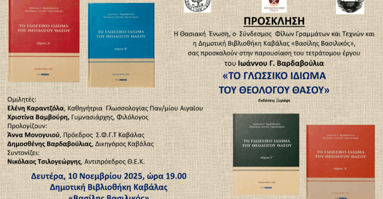 Μια ξεχωριστή εκδήλωση αφιερωμένη στη γλωσσική και πολιτιστική κληρονομιά της Θάσου θα πραγματοποιηθεί τη Δευτέρα 10 Νοεμβρίου 2025, στις 19:00, στη Δημοτική Βιβλιοθήκη Καβάλας “Βασίλης Βασιλικός” (Κασσάνδρου 6).