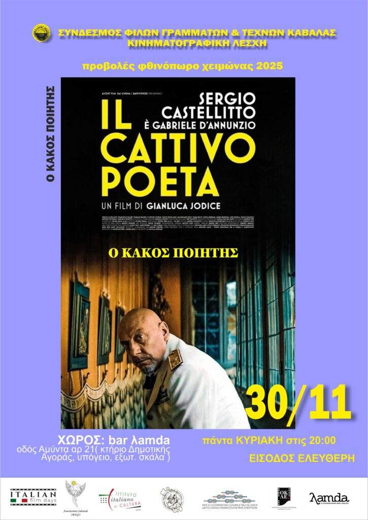Η Κινηματογραφική Λέσχη του ΣΦΓΤ Καβάλας συνεχίζει το αφιέρωμά της στον ιταλικό κινηματογράφο και την Κυριακή 30 Νοεμβρίου, στις 20:00, προβάλλει την ταινία «IL CATTIVO POETA / Ο ΚΑΚΟΣ ΠΟΙΗΤΗΣ» (2020, 106΄), με ελληνικούς υπότιτλους και ελεύθερη είσοδο για το κοινό.