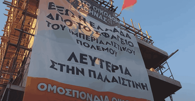 «Λευτεριά στην Παλαιστίνη»: Το Συνδικάτο Οικοδόμων ύψωσε γιγαντοπανό απέναντι από την ισραηλινή πρεσβεία (Video)