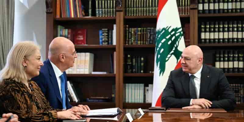 Ο κ. Δένδιας έγινε δεκτός από τον πρόεδρο του Λιβάνου και πρώην αρχηγό Ενόπλων Δυνάμεων Ζοζέφ Αούν στο Προεδρικό Μέγαρο. Παρών στη συνάντηση ήταν και ο υπουργός Άμυνας του Λιβάνου Μισέλ Μενάσαχ, ο γενικός γραμματέας Θρησκευμάτων, Γιώργος Καλαντζής και η πρέσβης της Ελλάδας στο Λίβανο, Δέσποινα Κουκουλοπούλου.