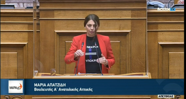 Επιχειρώντας να επιτεθεί στην κυβέρνηση για το πολύνεκρο δυστύχημα στα Τέμπη, η βουλευτής εμφανίστηκε στο βήμα της Βουλής με μπλούζα η οποία έγραφε «57 νεκροί, 156 υποκριτές»