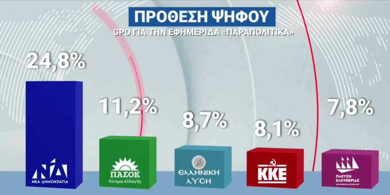 Στην έρευνα της GPO για την εφημερίδα «Παραπολιτικά» στην πρόθεση ψήφου η Νέα Δημοκρατία συγκεντρώνει 24,8%, ενώ ακολουθεί το ΠΑΣΟΚ με 11,2%.