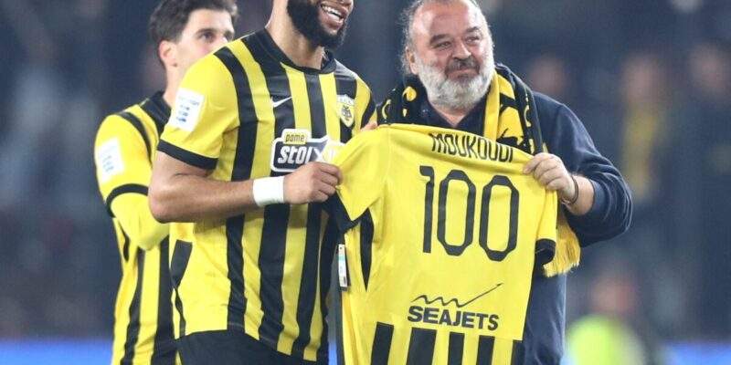 Ο Αρόλντ Μουκουντί συμπλήρωσε 100 αγώνες με την ΑΕΚ και ο Μάριος Ηλιόπουλος του έδωσε αναμνηστική φανέλα