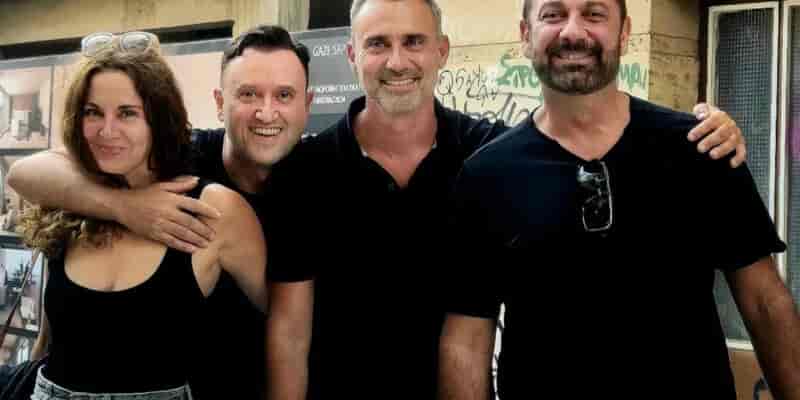 Ο Γιώργος Καπουτζίδης ποζάρει με την παρέα του «Πάρα Πέντε» μετά την κηδεία του Γεράσιμου Μιχελή